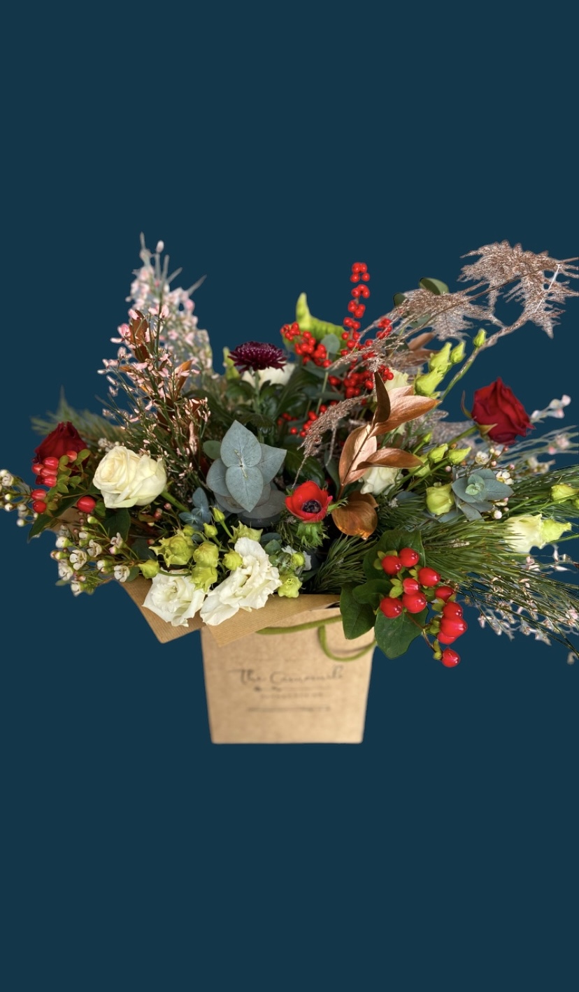 Our Festive Bouquet is a perfect choice foe adding festive cheer yo any space or as a thoughtful seasonal gift. Featuring radiant red flowers paired with fresh, aromatic evergreen brunches, this arrangement capture the warmth and joy of the holidays. Elegant golden accents add a hint of sparkle , making the bouquet ideal for Christmas decor or luxurious gift.