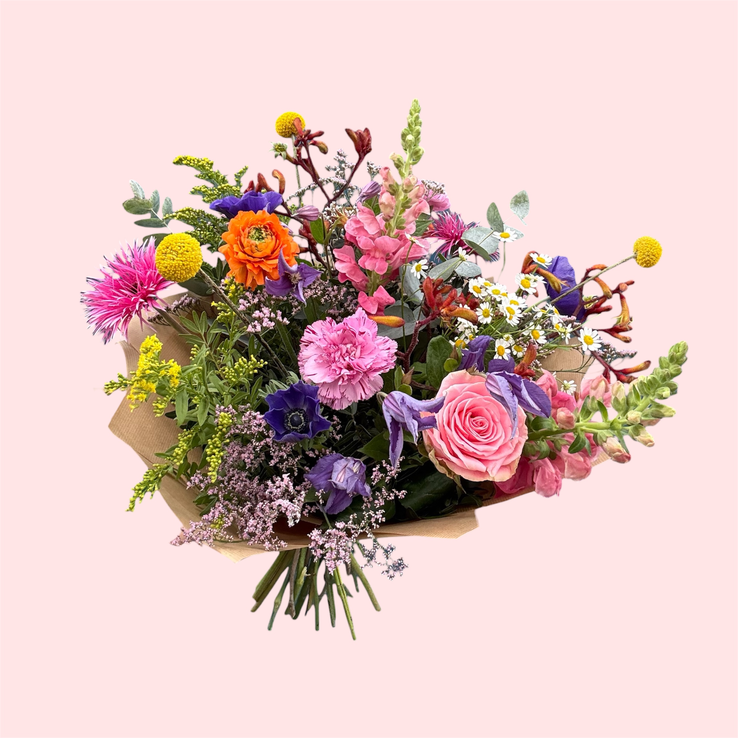 Designed using the freshest flowers of the day, this arrangement celebrate bright pinks, sunny yellow, rich oranges, purples and pops of green. It’s playful, full of texture and created to instantly life the mood in any room.